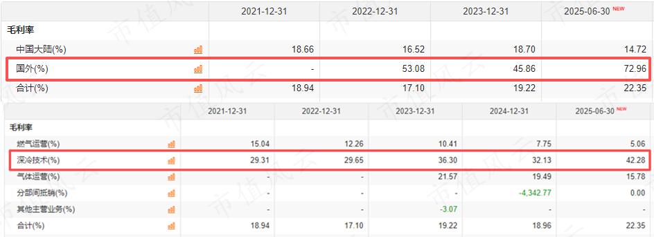 更为关键的是,海外订单的毛利率显著高于国内,深冷设备的毛利率也明显高于其他板块。2025年上半年,深冷设备毛利率达42.3%,海外业务的毛利率更是高达72.96%。