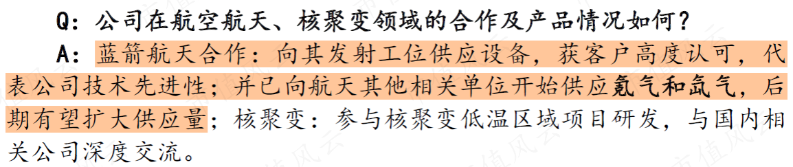 在核聚变领域,公司曾参与核聚变低温区域项目研发,深冷技术及装置已应用于可控核聚变相关项目。