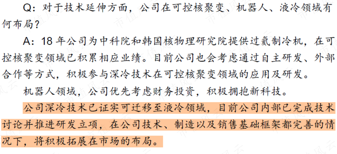 在液冷领域,其深冷技术已证实可迁移至液冷领域,目前公司内部已完成技术讨论并推进研发立项。