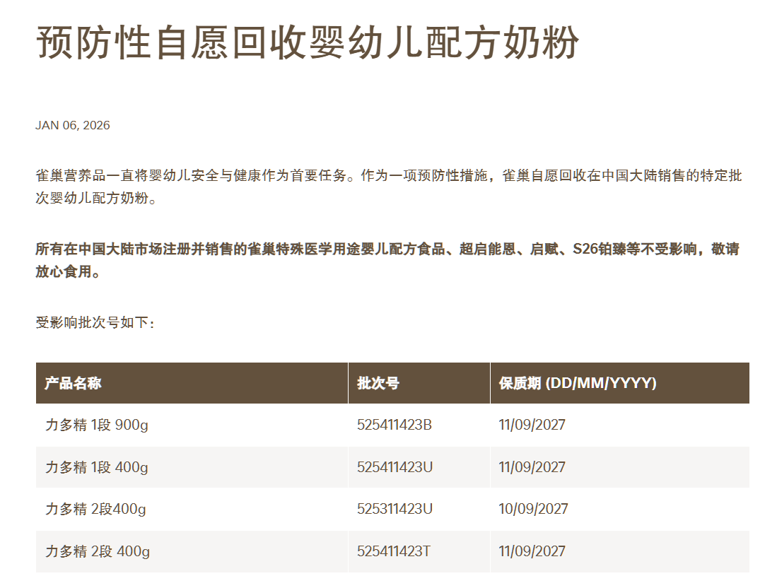 1月6日,雀巢大中华区官方网站发布两则《预防性自愿回收婴幼儿配方奶粉》公告。一份公告针对在中国大陆销售的特定批次婴幼儿配方奶粉,涉及力多精、铂初能恩、舒宜能恩以及惠氏膳儿加儿童成长奶粉等30批次产品。另一份公告则针对所有此次涉事的进口自欧洲、在中国大陆跨境电商渠道销售的婴幼儿配方奶粉,涉及“Nestlé BEBA Supreme”“惠氏Wyeth启赋未来”等41批次产品。