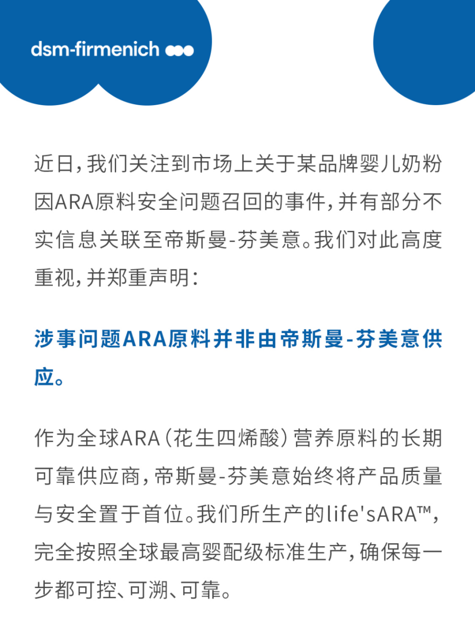 1月7日,帝斯曼通过官方公众号发布声明称,涉事问题ARA原料并非由帝斯曼-芬美意供应。该公司同时称,因以上事件影响,其ARA原料需求激增,将全力协调产能,满足市场需求。