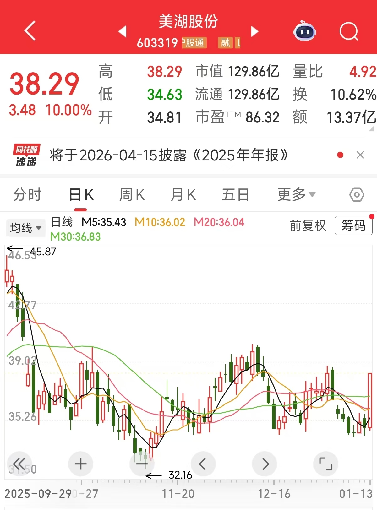 上证报中国证券网讯(记者 窦世平)截至1月13日午间收盘,美湖股份(603319)涨停,报38.29元/股。