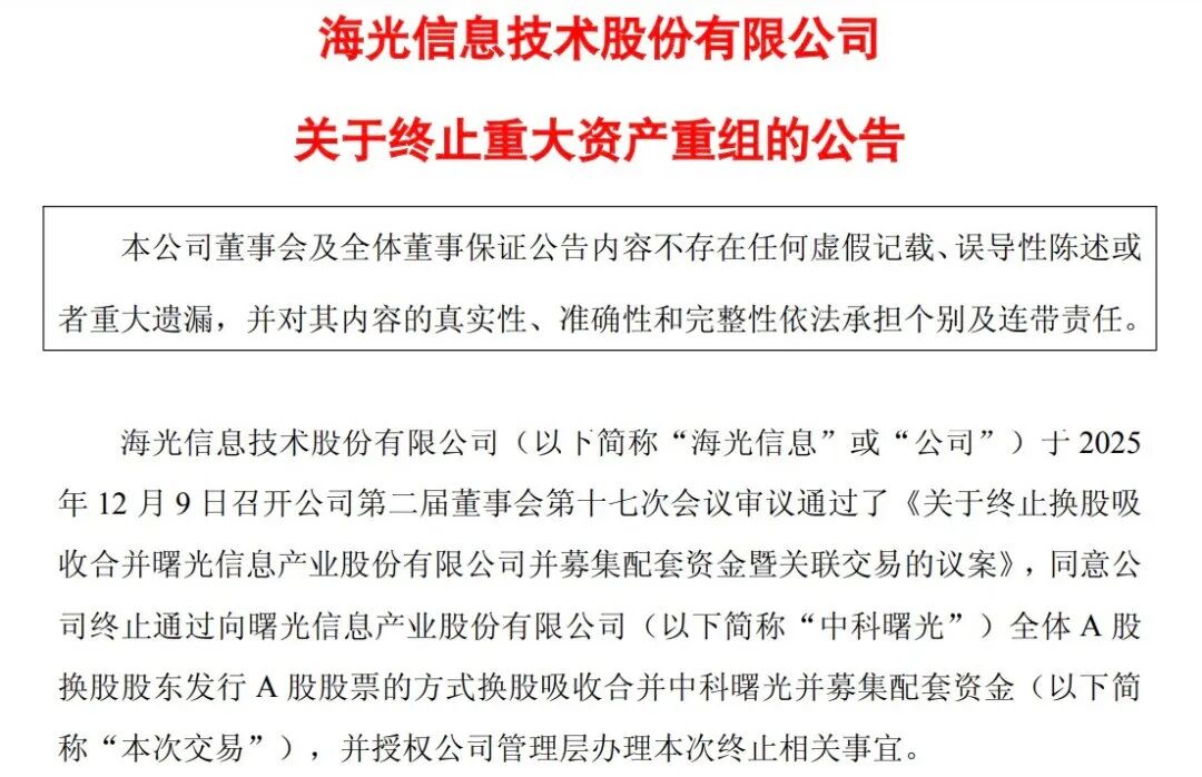 12月9日晚间,市值超5000亿元的海光信息公告称,公司董事会审议通过了《关于终止换股吸收合并曙光信息产业股份有限公司并募集配套资金暨关联交易的议案》,决定终止通过向中科曙光(603019)全体A股换股股东发行A股股票的方式换股吸收合并中科曙光并募集配套资金。同日,中科曙光也发布了终止重组事宜的公告。