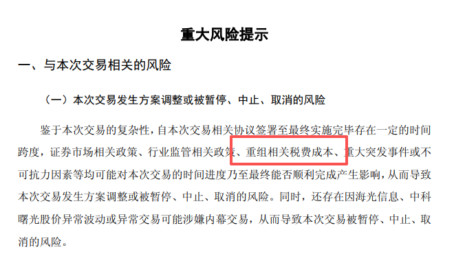 6月9日,海光信息在重组预案的风险提示中,曾提及重组相关税费成本问题。