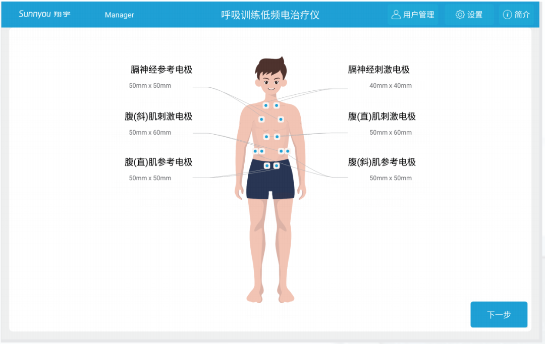 主动呼吸训练:患者根据呼吸传感器采集反馈,在动态变化的声光提示和电刺激下,进行呼吸训练,达到缓慢调整呼吸频率的作用;
