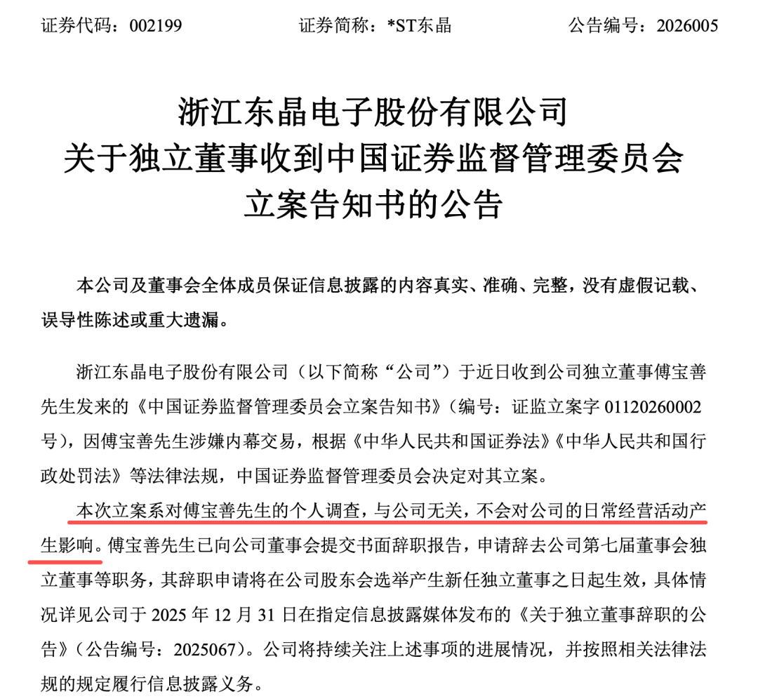 1月13日晚间,*ST东晶公告称,公司独立董事傅宝善因涉嫌内幕交易,被中国证券监督管理委员会立案。