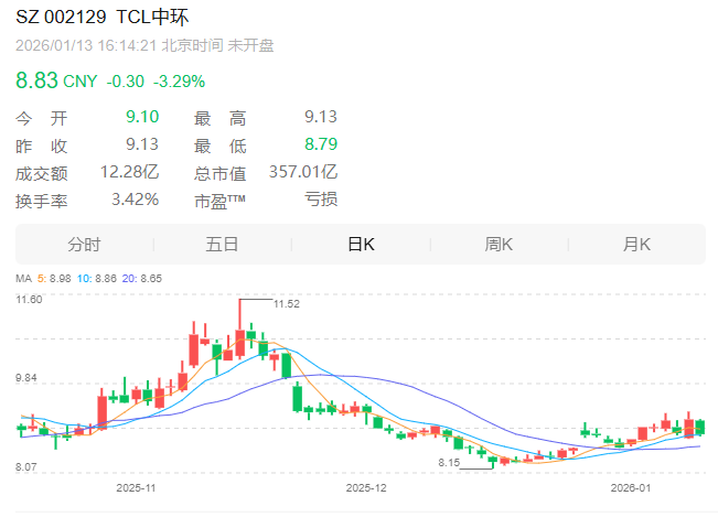 二级市场上,截至1月13日收盘,TCL中环下跌3.29%报8.83元/股,总市值约357.01亿元,近一年来公司股价上涨约7%。