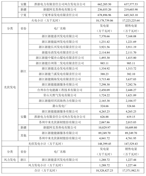 浙能电力全资及控股发电企业2025年全年发电量及上网电量数据如下: