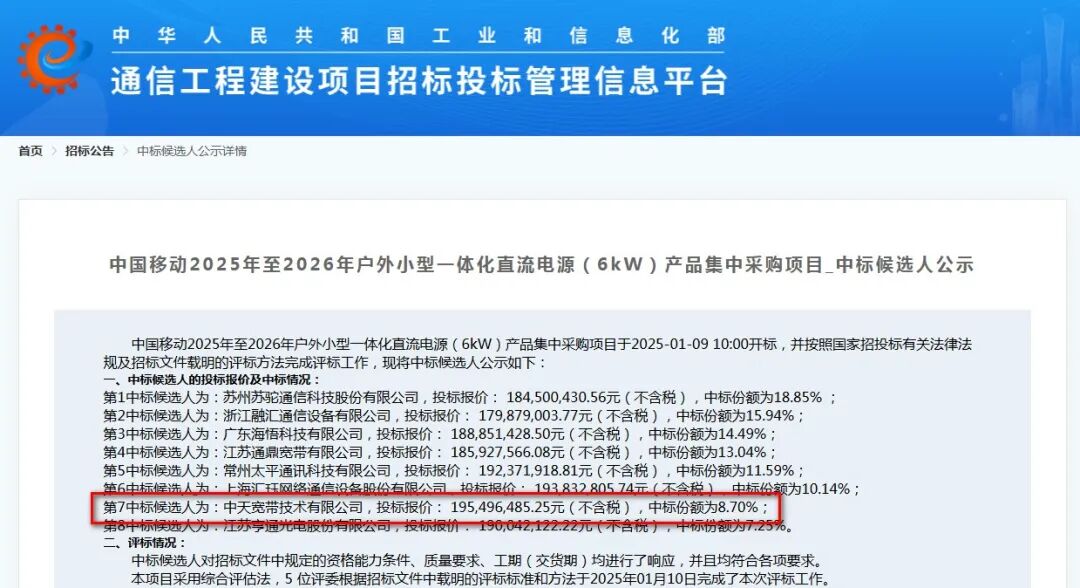 通报显示,违约事件关联项目为“中国移动2025年至2026年户外小型一体化直流电源(6KW)产品集中采购项目”。据公开信息梳理,该项目于2024年底启动招标,采购规模达3.86万套户外小型一体化直流电源(6kW),吸引多家行业企业参与竞标。2025年2月,中标结果公示,苏驼通信、融汇通信设备、海悟科技等8家企业成功中标,中天宽带位列其中,获得8.70%的项目份额。值得关注的是,在8家中标企业中,中天宽带的投标报价最高,不含税金额达195496485.25元,远超项目平均报价水平。