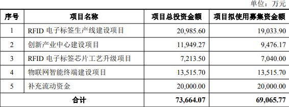 本次发行的募集资金总额不超过69,065.77万元(含本数),扣除发行费用后将全部用于RFID电子标签生产线建设项目、创新产业(300832)中心建设项目、RFID电子标签芯片工艺升级项目、物联网智能终端建设项目、补充流动资金。