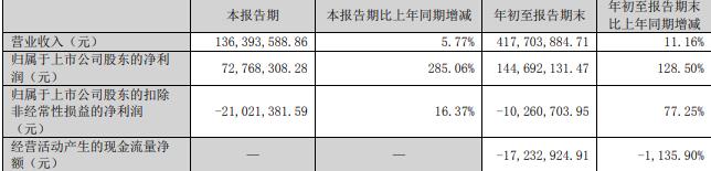 据公司2025年第三季度报告,本报告期,公司实现营业收入1.36亿元,同比增长5.77%;归属于上市公司股东的净利润7276.83万元,同比增长285.06%;归属于上市公司股东的扣除非经常性损益的净利润为-2102.14万元。