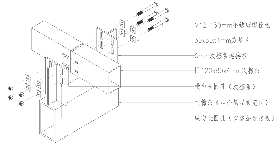 为解决滑移中难以避免的细微双向偏差(水平X轴/Y轴方向)和振动传导,项目团队在檩条与屋面钢结构之间采用了双向长圆孔连接,该设计是针对钢结构整体滑移过程中屋面系统双向扰动控制的关键技术措施。双向长圆孔设计允许檩条与钢结构之间在水平X轴和Y轴两个方向上产生有限的、可控的微量位移,从而主动释放在滑移过程中因导向偏差、基础不均匀沉降或振动扰动时引发的部分约束应力。