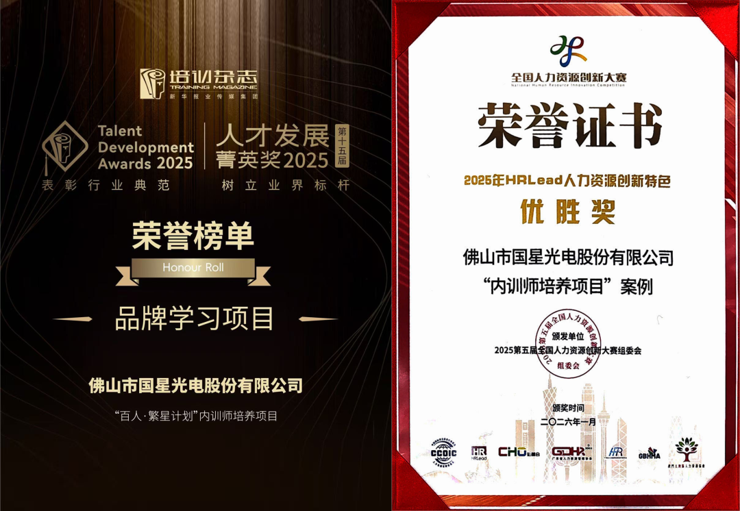 近日,国星光电(002449)“百人·繁星计划”内训师培养项目连获两项行业大奖——《培训》杂志2025(第十五届)人才发展菁英奖——品牌学习项目、第五届全国人力资源创新大赛——创新特色案例类优胜奖。
