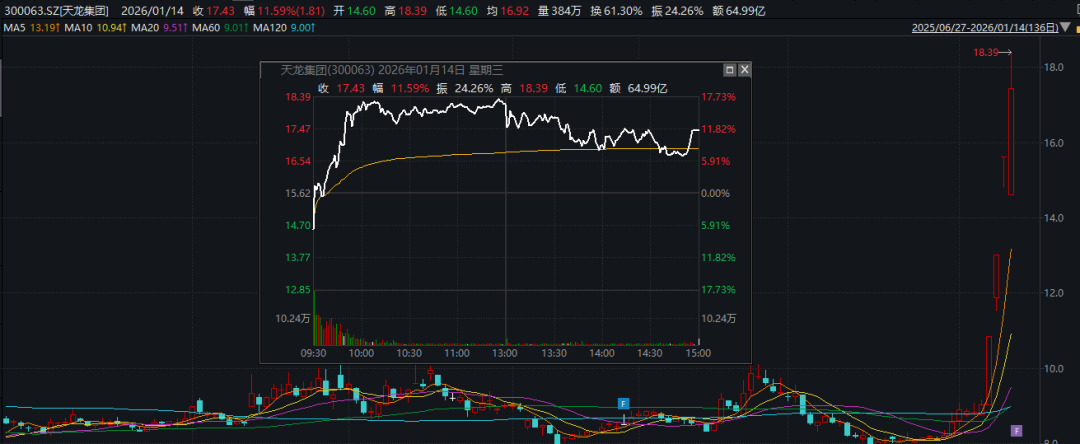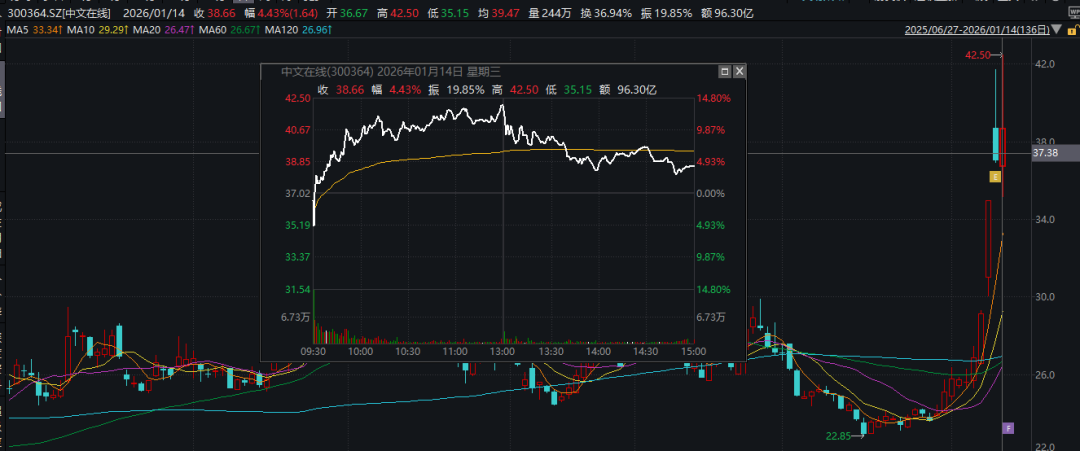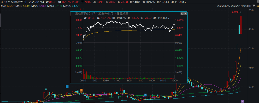 行情资料显示,自2025年12月31日以来,易点天下股价累计上涨超120%,其中两个交易日20%涨停。今日(1月14日),公司股价最高涨超19%,收盘仍有超16%的涨幅。