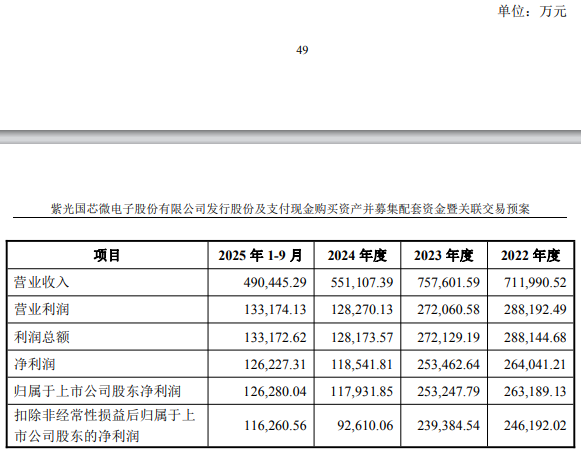 2022年度、2023年度、2024年度、2025年前三季度,紫光国微营业收入分别为711,990.52万元、757,601.59万元、551,107.39万元、490,445.29万元,归属于上市公司股东净利润分别为263,189.13万元、253,247.79万元、117,931.85万元、126,280.04万元。