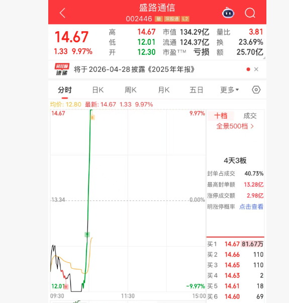 上证报中国证券网讯(记者 李五强)2026年1月15日,盛路通信(002446)一度跌停,10时30分左右突然直线拉升至涨停,上演“地天板”行情,截至10时34分,报14.67元/股,涨9.97%,成交额25.70亿元,换手率达23.69%,封单超过80万手。