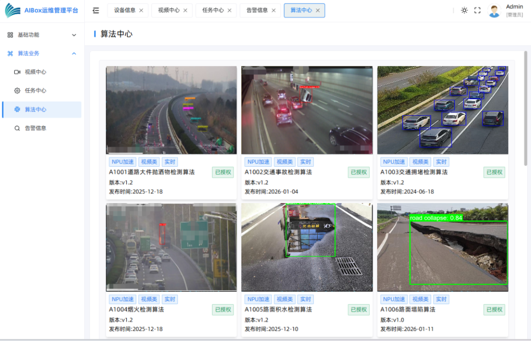 打破传统感知体系“只传不析、只看不管”的固有局限,AI Box 以“边缘大脑”为核心能力,形成端侧智能闭环。产品同步推出8路/16路/32路三款系列化型号,全面支持多路视频流并发接入与多种交通专用算法的并行推理。依托差异化算力配置与模块化设计,AIBox可灵活适配不同规模的交通管控场景,无缝覆盖从单一交叉口到成片路段、区域级道路的应用需求,快速、精准识别各类典型交通事件。在事件发现的第一时间,AIBox终端可联动现场声光报警,并将预警信息实时推送至交通管控平台,形成“边缘发现—即时报警—快速处置”的毫秒级闭环管控机制,显著提升现场响应效率与实战处置能力,充分彰显 AI Box 在交通场景下的高可靠检测能力与工程化落地价值。
