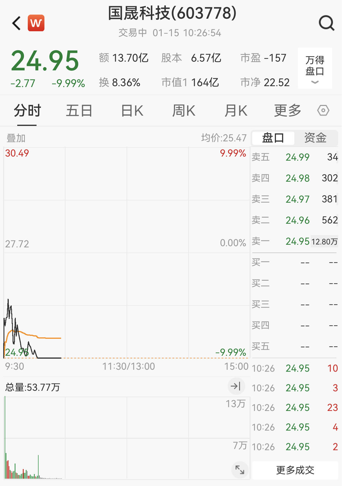 1月15日,A股市场近期最受关注的“明星股”国晟科技(603778)(603778.SH)开盘即跌停,截至10时26分,股价报24.95元/股。