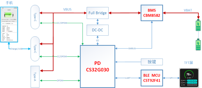 方案阐述:本方案在原本成熟的CS32G030充电宝方案基础上,仅需增加一颗BMS芯片CBM8582,即可实现对电池状态的精准监测。监测数据通过PD芯片CS32G030上传至手机APP,为用户提供直观的设备状态管理与安全监控,轻松实现产品智能化升级。