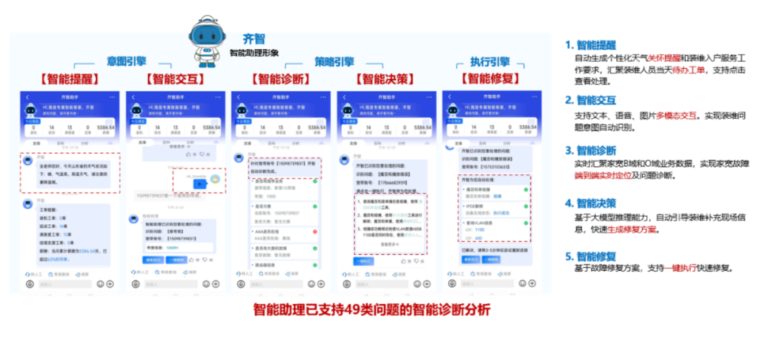 案例上线后,实现装维工单自助解决率提升至65%,处理时长减少45%,有效支撑了覆盖2000万用户、8000名装维人员的庞大服务体系,成功推动家宽综调支撑从“+AI”向“AI+”的智能化转型,为通信行业网络运维领域树立了降本增效的典范。