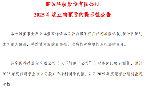 就在今年1月7日,掌阅科技刚刚发布了2025年的业绩预亏公告。公告称,经掌阅科技财务部门初步测算,预计2025年度归母净利润为负值,公司2025年度经营业绩将出现亏损。这将是公司上市以来首次出现年度亏损,业绩承压、资金流趋紧也将使公司对短剧的进一步投入和运作产生一定影响。