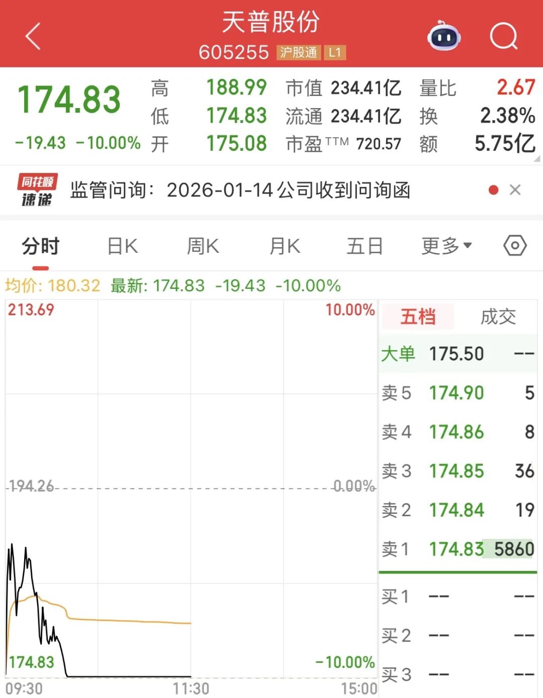 市场反应立竿见影。1月15日,天普股份股价持续走低,截至午间收盘,股价跌停,报174.83元/股。