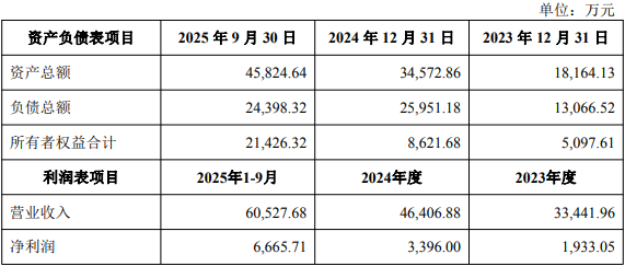 公告显示,2023年、2024年、2025年1-9月,标的公司南通纳尔的营业收入分别为33,441.96万元、46,406.88万元、60,527.68万元;净利润分别为1,933.05万元、3,396.00万元、6,665.71万元。