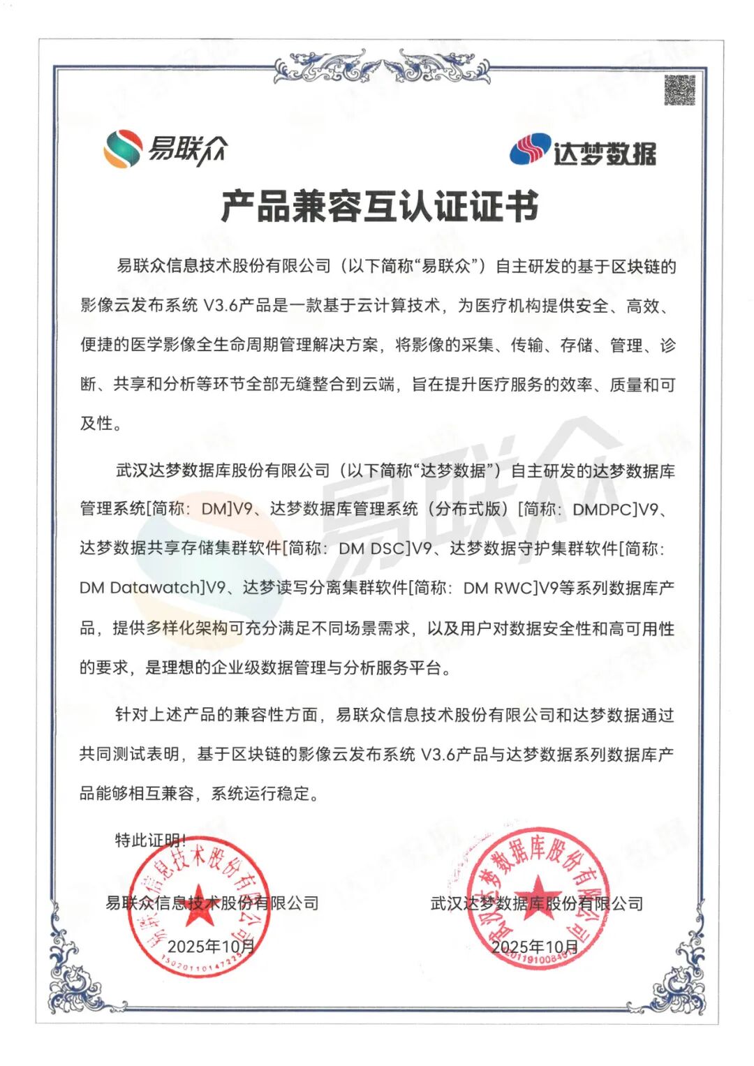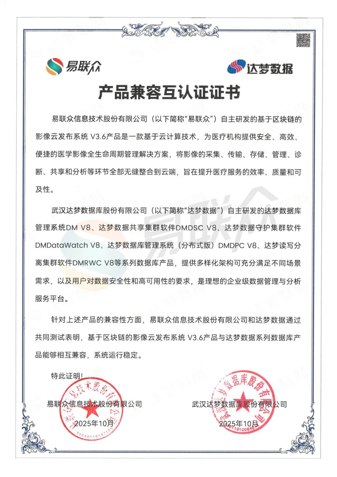 近期,易联众自主研发的基于区块链的影像云发布系统 V3.6与达梦数据DM V8系列、DM V9系列数据库产品完成兼容互认证。经双方联合测试验证,该系统与达梦数据系列数据库产品相互兼容、运行稳定,各项性能指标均符合行业标准,标志着易联众在医疗影像数字化领域的国产化适配能力再获认可,可为医疗行业数据安全协作与高效管理提供技术支撑。
