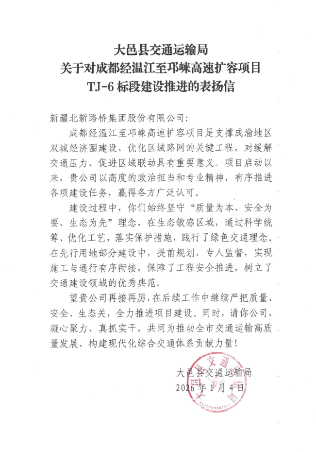 近日,北新路桥(002307)集团四川分公司承建的四川省成温邛TJ6标段收到大邑县交通局、新场镇人民政府、王泗镇人民政府、晋原街道办事处等多家政府单位发来的表扬信,对项目在征迁协调、施工质量管控、安全生产及生态环保等方面取得的突出成效给予充分肯定,高度赞扬项目团队展现出的国企担当和专业实力。