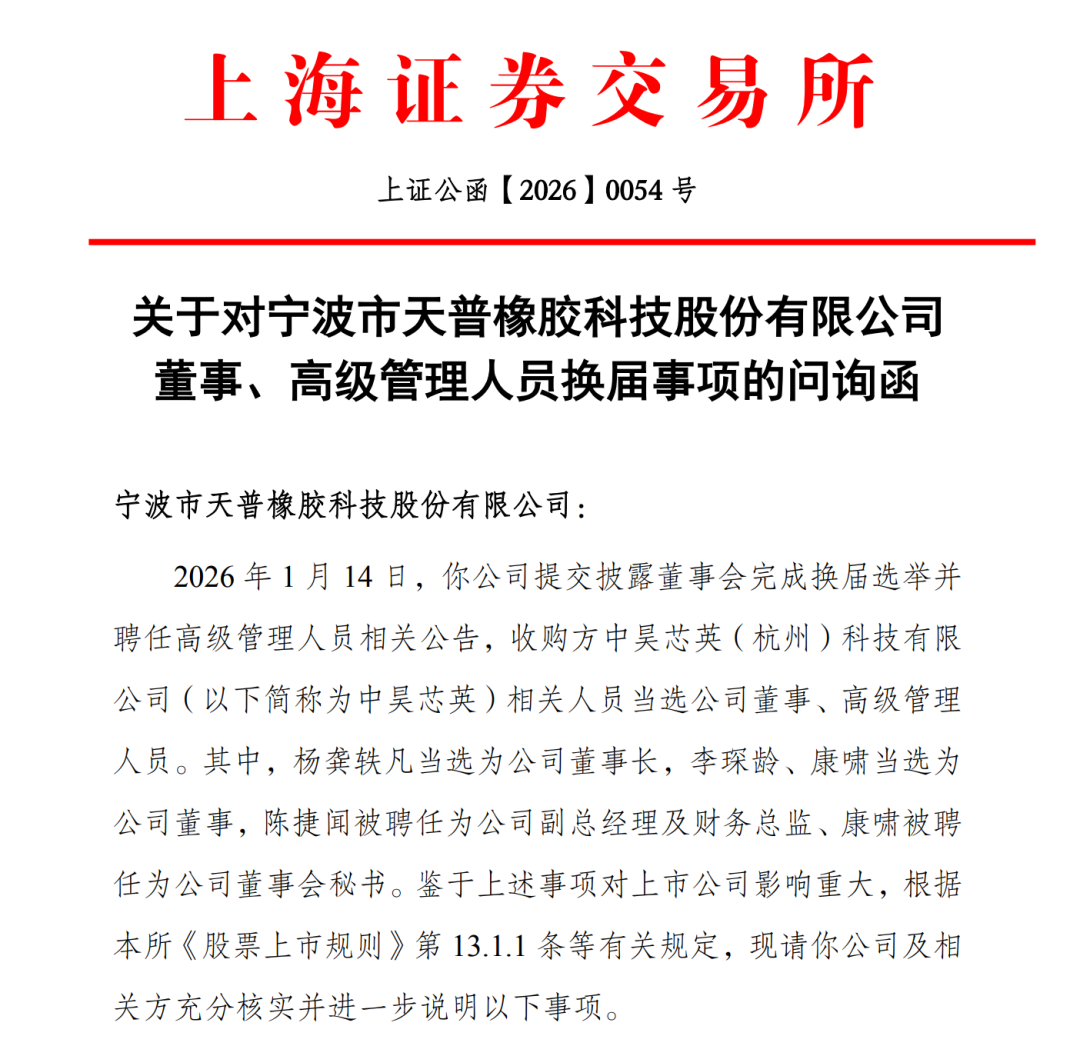 1月14日晚间,上交所就公司董事会换届、聘任高管相关事项,向天普股份发出问询函。从内容来看,上交所一连追问数条,直指天普股份此前“无改变主营业务计划”“与股东中昊芯英自身现有资本证券化路径无关”的承诺,与此次管理层“大换血”之间存在明显反差,质疑其是否“言行相悖”。