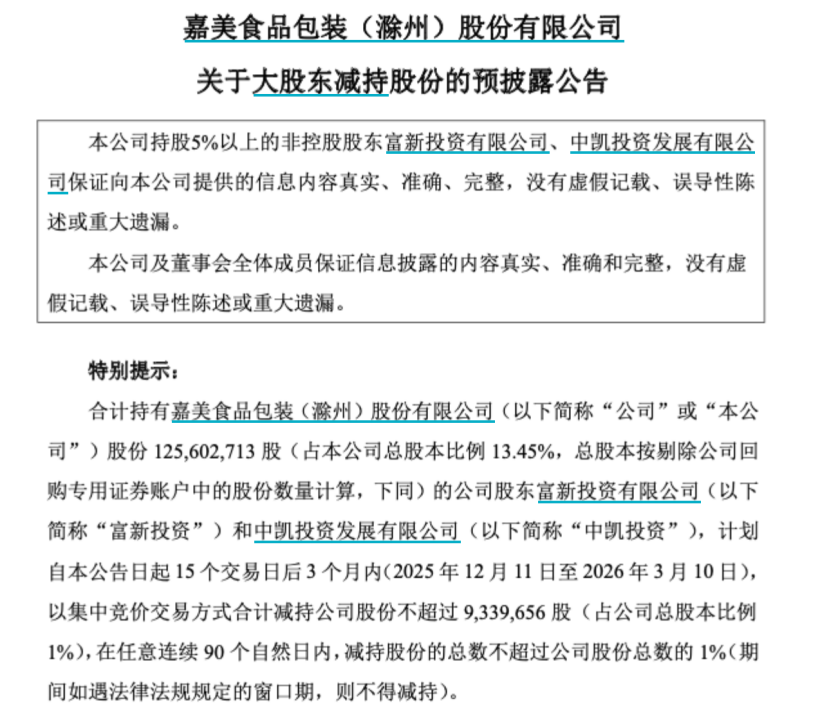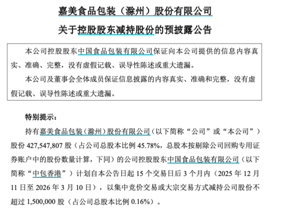 截至2025年9月30日,公司控股股东中包香港持有嘉美包装44.75%的股份,公司实控人为陈民、厉翠玲。值得一提的是,11月18日,中包香港公告称,计划以集中竞价交易或大宗交易方式减持不超过150万股,占公司总股本比例为0.16%。