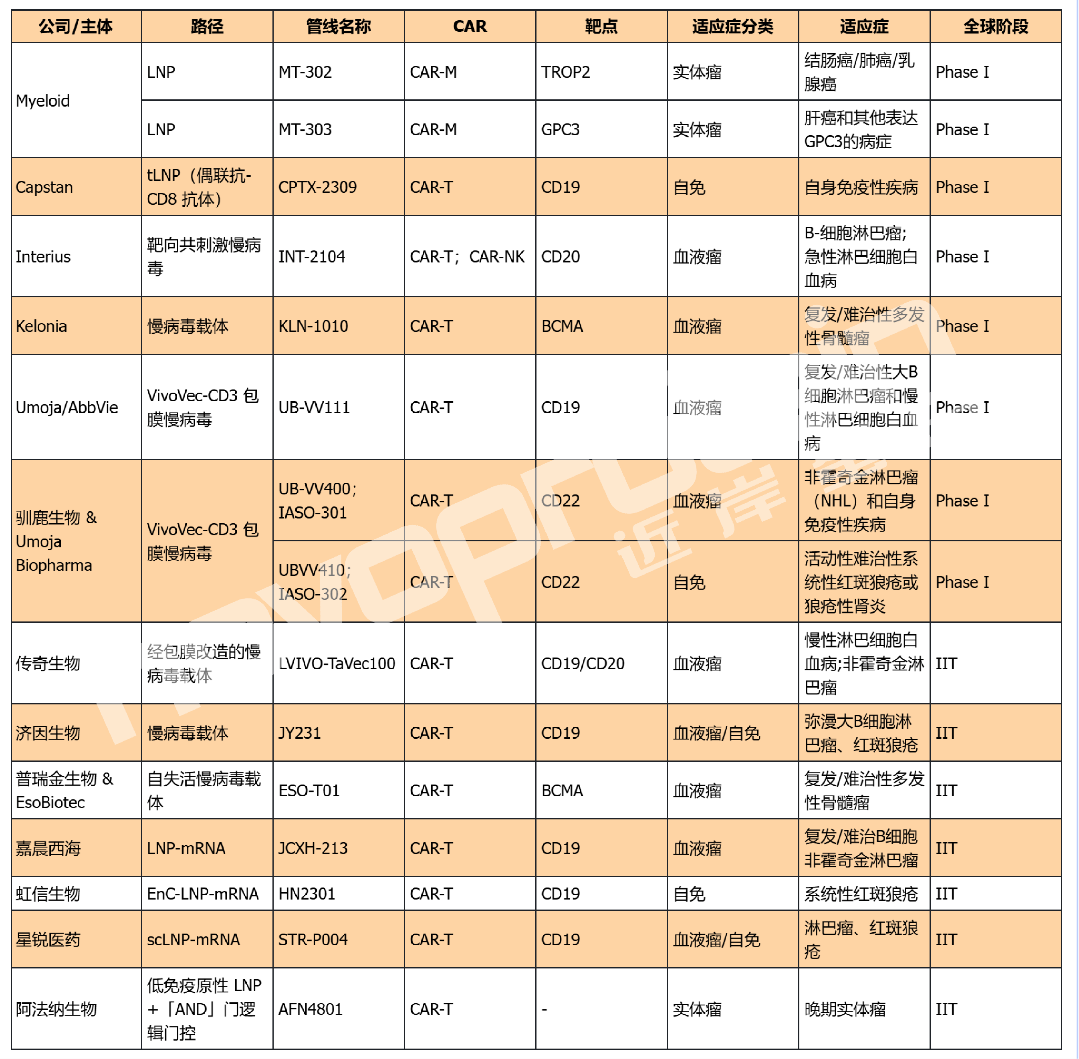 全球I期/IIT In Vivo CAR管线