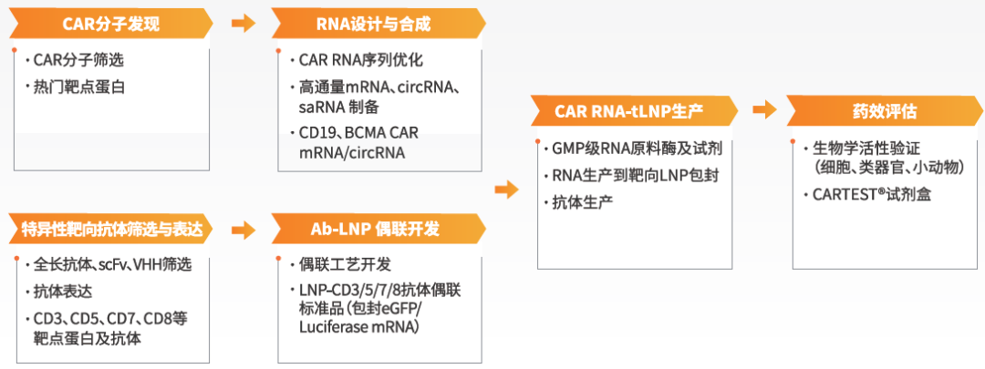 围绕当前热度不断攀升的in vivo CAR疗法,近岸蛋白整合了从CAR分子发现到靶向递送工艺的全流程研发解决方案: