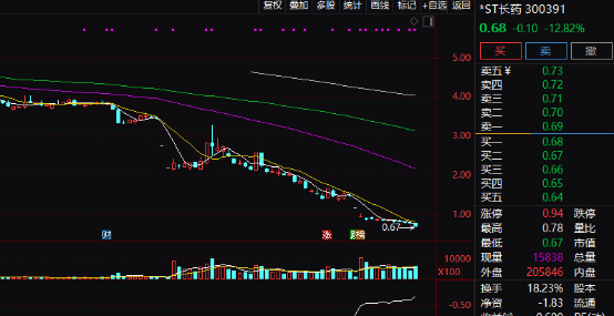 比如*ST长药最近一段时间股价表现低迷,从2025年12月30日开始股价跌破1元,此后进一步下跌,最新股价已跌至0.68元/股,并已连续11个交易日收盘价低于1元。最近一个月时间里,*ST长药股价已经累计下跌逾六成。