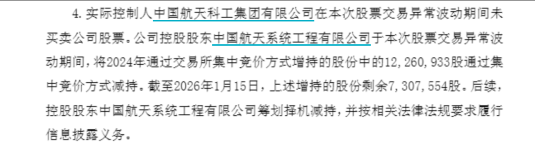 1月15日晚,商业航天大牛股航天发展(000547)发布股票交易异常波动公告,公司股票连续三个交易日收盘价格跌幅偏离值累计超过20%。公司控股股东中国航天系统工程有限公司于此次股票交易异常波动期间,将2024年通过交易所集中竞价方式增持的股份中的1226.09万股通过集中竞价方式减持。截至2026年1月15日,上述增持的股份剩余730.76万股。后续,控股股东中国航天系统工程有限公司筹划择机减持。