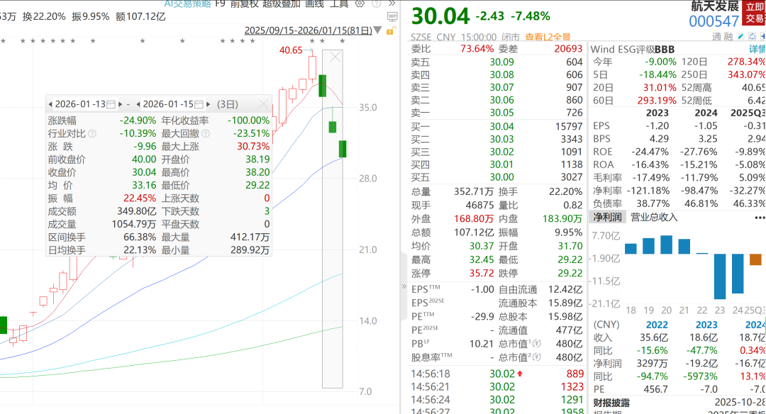 二级市场上,A股商业航天板块近日连续回调,截至1月15日,商业航天指数近3日回撤近4%,航天发展1月15日盘中跌停,近3个交易日来股价重挫近25%,市值跌至480亿,航天发展自2025年9月29日低点迄今股价累计最大涨幅达452%。