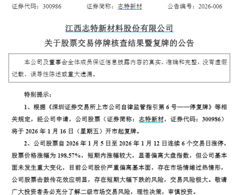 志特新材此次公告中称,就股价波动的相关事项的相关自查工作已完成,公司股票将于1月16日开市起复牌。