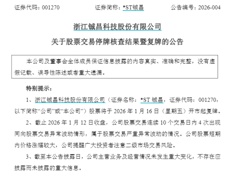*ST铖昌核查后称,公司前期披露的信息不存在需要更正、补充之处;公司目前经营情况正常,内外部经营环境未发生重大变化;公司控股股东和实际控制人不存在关于本公司应披露而未披露的重大事项,或处于筹划阶段的重大事项;公司控股股东和实际控制人不存在关于本公司应披露而未披露的重大事项,或处于筹划阶段的重大事项等一系列情形。公司股票将于1月16日开市起复牌。