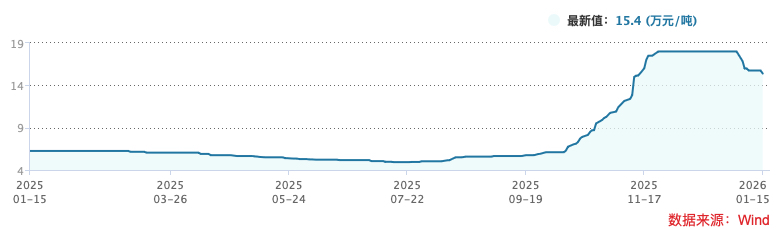 2025年,六氟磷酸锂价格迎来强势反弹。数据显示,六氟磷酸锂价格从年内最低价4.7万元/吨一路攀升,最高涨至18万元/吨,最大涨幅高达283%。截至2026年1月中旬,市场价格稳定在15.3万元/吨~16万元/吨区间,较2025年7月上涨超220%。