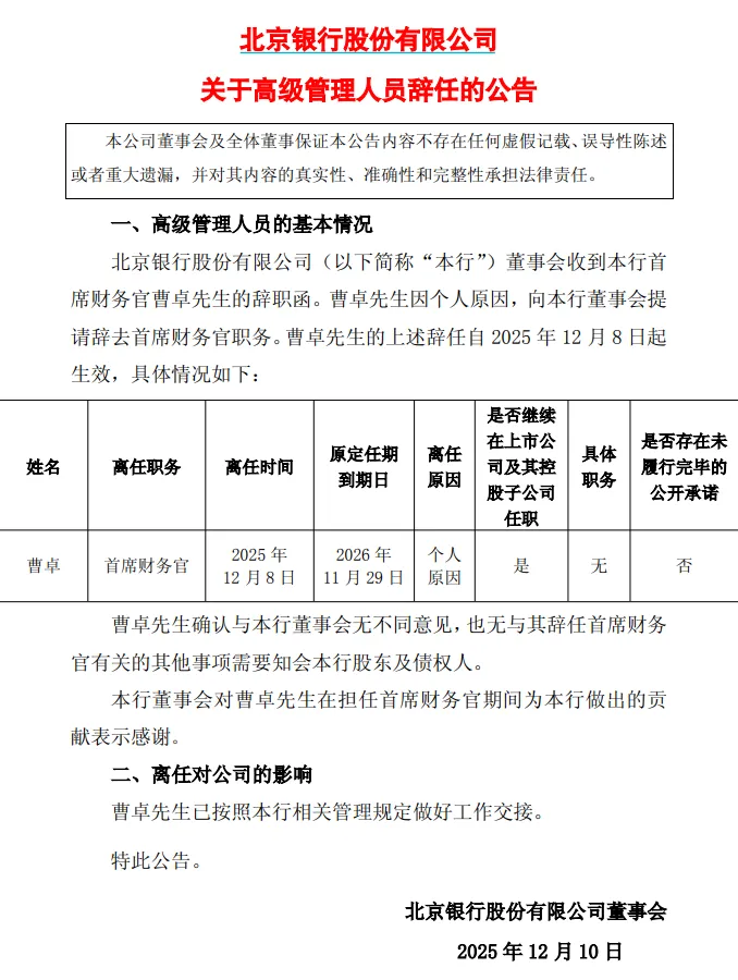 12月9日,北京银行(601169)发布公告称,该行董事会收到首席财务官曹卓的辞职函。曹卓因个人原因,向该行董事会提请辞去首席财务官职务。曹卓的上述辞任自2025年12月8日起生效。