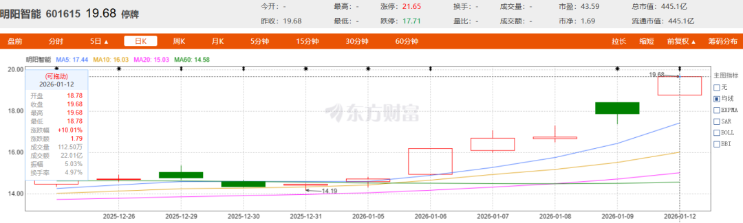 受此消息影响,明阳智能1月12日当天,股价直接以涨停收盘,涨幅超10%,报19.68元/股,对应总市值约445亿元。