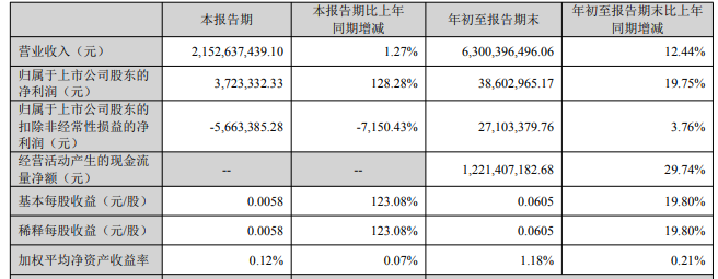 2025年前三季度,公司营业收入为63亿元,同比增长12.44%;归母净利润为3860.30万元,同比增长19.75%;扣非归母净利润为2710.34万元,同比增长3.76%。