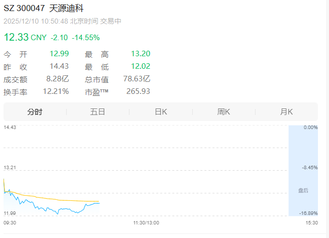 二级市场上,截至12月10日发稿,天源迪科暴跌14.55%,报12.33元/股,总市值78.63亿元。