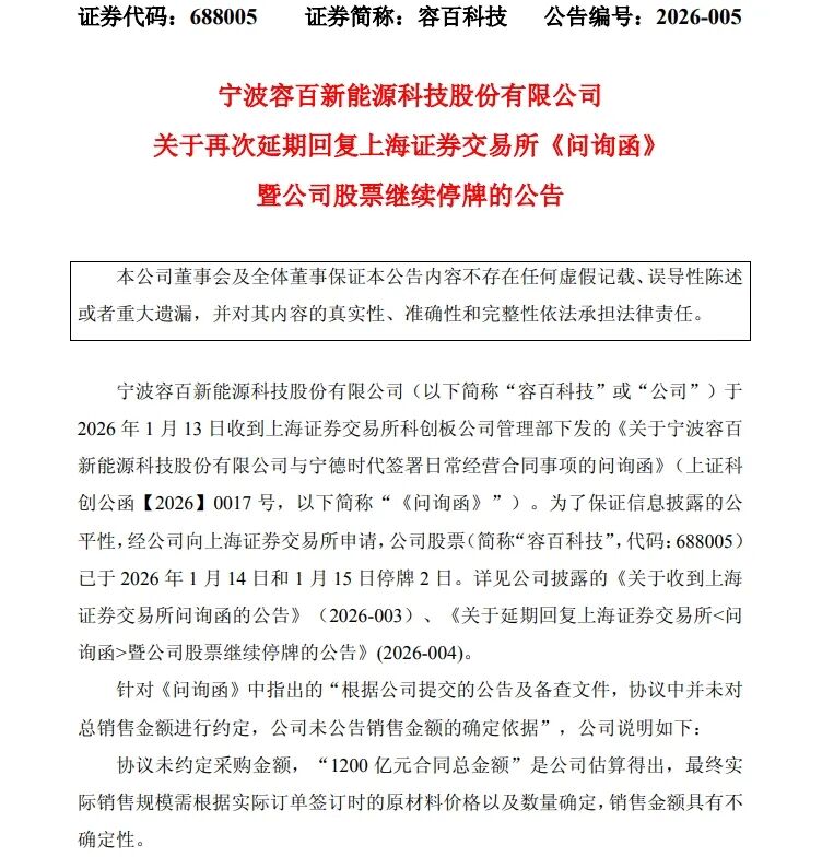 1月15日晚,容百科技发布关于再次延期回复《问询函》暨公司股票继续停牌的公告,针对1月13日《问询函》中提及的“根据公司提交的公告及备查文件,协议中并未对总销售金额进行约定,公司未公告销售金额的确定依据”做出说明。