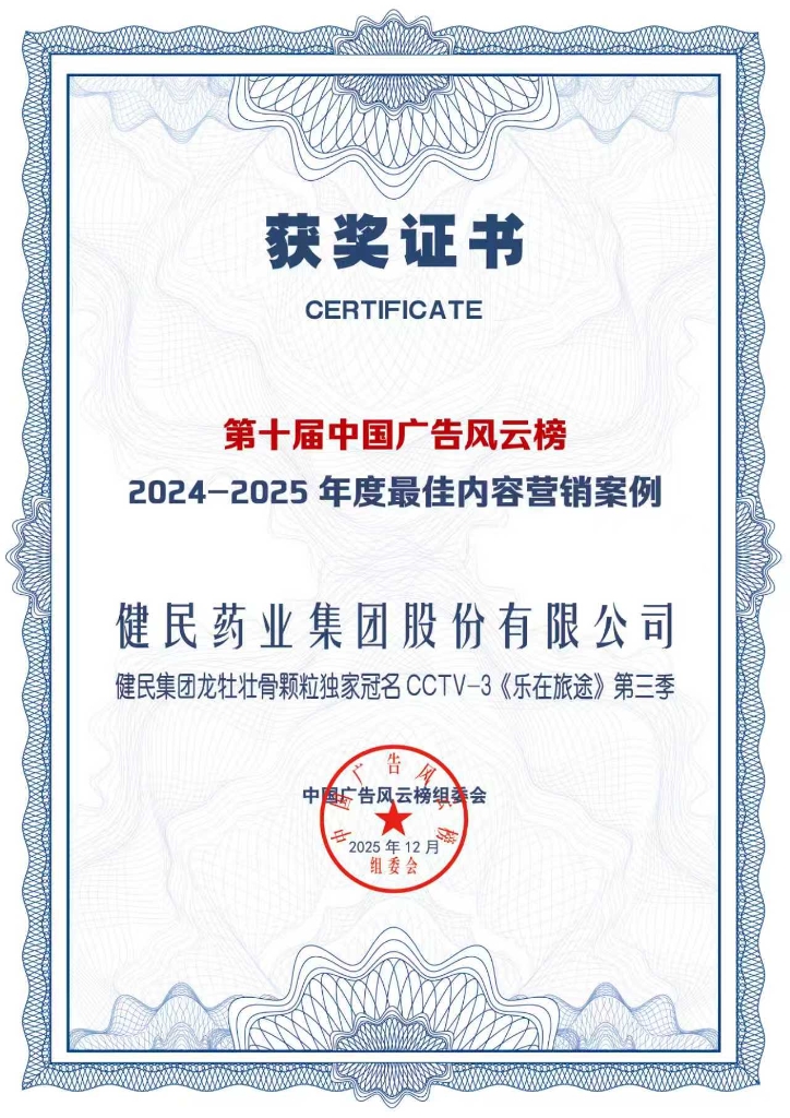 健民集团(600976)旗下核心产品龙牡壮骨颗粒独家冠名CCTV-3《乐在旅途》第三季的营销案例,成功斩获第十届中国广告风云榜“2024-2025年度最佳内容营销案例”奖项,这既是行业对集团品牌营销实力的认可,也是对龙牡壮骨颗粒深耕儿童健康事业的肯定!