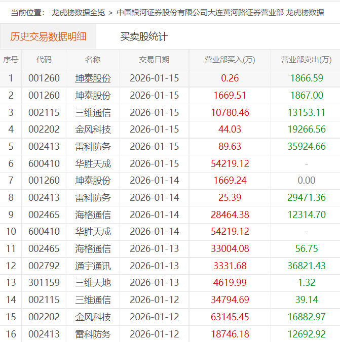 与此同时,1月15日,陈小群并没有闲着,几乎卖出所有持仓。1月14日龙虎榜显示,大连黄河路单日净买入华胜天成(600410)5.42亿元,而在1月15日的三日榜显示,大连黄河路仍只买入5.42亿元,这表明,大连黄河路在15日并没有操作华胜天成。那么表明,1月15日,大连黄河路整天都在“出货”。个股方面,当日,三维通信(002115)震荡走低,呈现出货走势;金风科技(002202)、雷科防务(002413)早盘快速核按钮跌停。