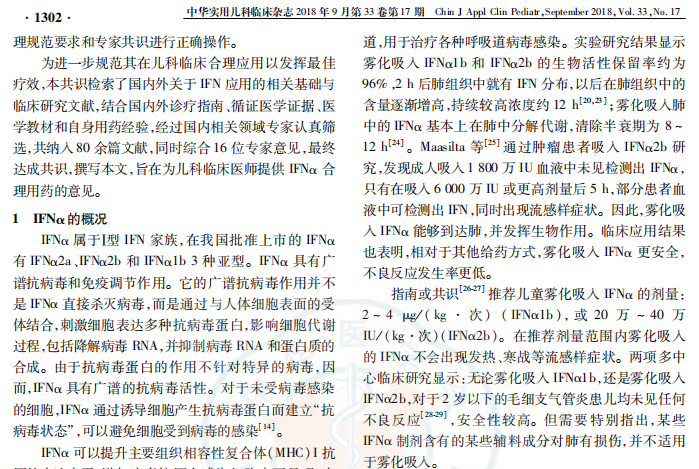 《重组人干扰素-α1b在儿科的临床应用专家共识》中提到干扰素用于儿童呼吸道病毒感染的治疗[4]。《α干扰素在儿科临床合理应用专家共识》也指出,雾化吸入干扰素是治疗儿童病毒性肺炎、毛细支气管炎的首选抗病毒疗法之一[5]。此外,《疱疹性咽峡炎诊断及治疗专家共识(2019年版)》、《抗病毒药物在儿童病毒感染性呼吸道疾病中的合理应用指南》、《中国儿童呼吸道合胞病毒感染诊疗及预防指南(2024医生版)》、《儿童喘息性疾病合理用药指南》、《儿童社区获得性肺炎管理指南(2024修订)》等众多指南共识均有指引[6-10]。