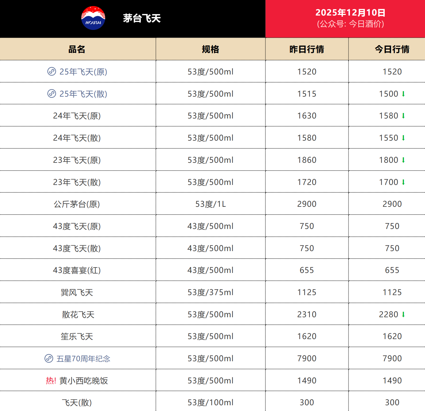 上证报中国证券网讯(记者高志刚)据酒业数据平台“今日酒价”12月10日最新数据显示,25年飞天(散)53度/500ml批发价为1500元/瓶,较昨日下跌15元;25年飞天(原)53度/500ml价格报1520元/瓶,与昨日持平。