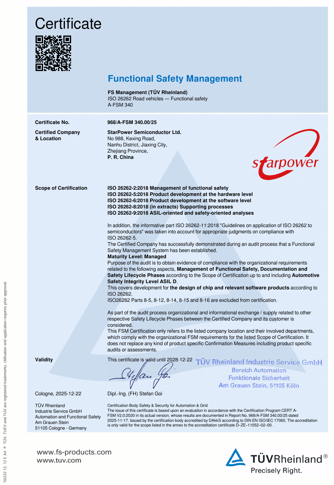 近日,斯达半导体股份有限公司(以下简称“斯达半导体”)正式获得德国莱茵T V集团(以下简称“T V莱茵”)颁发的ISO 26262:2018功能安全管理体系认证证书。这标志着斯达半导体已为其MCU等产品建立起符合汽车功能安全最高等级“ASIL D”要求的开发流程体系,具备为行业提供高安全、高可靠性产品与解决方案的完整能力。