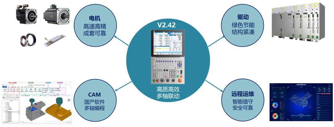 在软件层面,系统以V2.42数控系统为核心,具备强大的五轴加工功能。系统支持RTCP、五轴空间误差补偿、主轴热误差补偿等关键技术,并通过“超匀顺曲面插补”算法实现复杂曲面的高速高精加工。配套的“千机CAM”软件专为五轴编程优化,与数控系统无缝协同。此外,方案还集成远程运维与数据分析工具,支持工艺优化与全周期服务,构建了从编程到运维的数字化支撑生态。